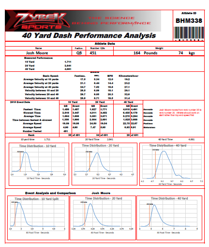 It’s a 40+ page comprehensive analysis which details the performance of an athlete who has taken the Standardized Athletic Test. Along with performance tips, it includes information showing how an athlete stacks up to others in the same class playing the same position.